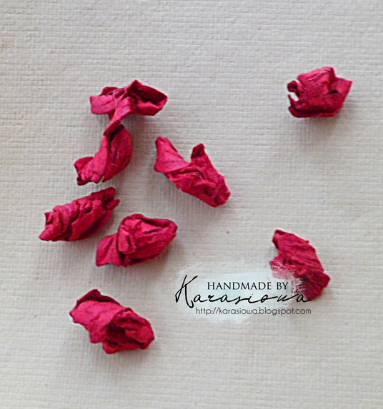Do wykonania kwiatków potrzebujemy papieru, ja użyłam czerwony papier czerpany, dłutka, aplikatora z wodą, maty, kleju i wykrojnika Notched Flowers Die (set of 2) a także zielonego papieru czerpanego na listki i wykrojnika Two Leaves Die (Set of 2).