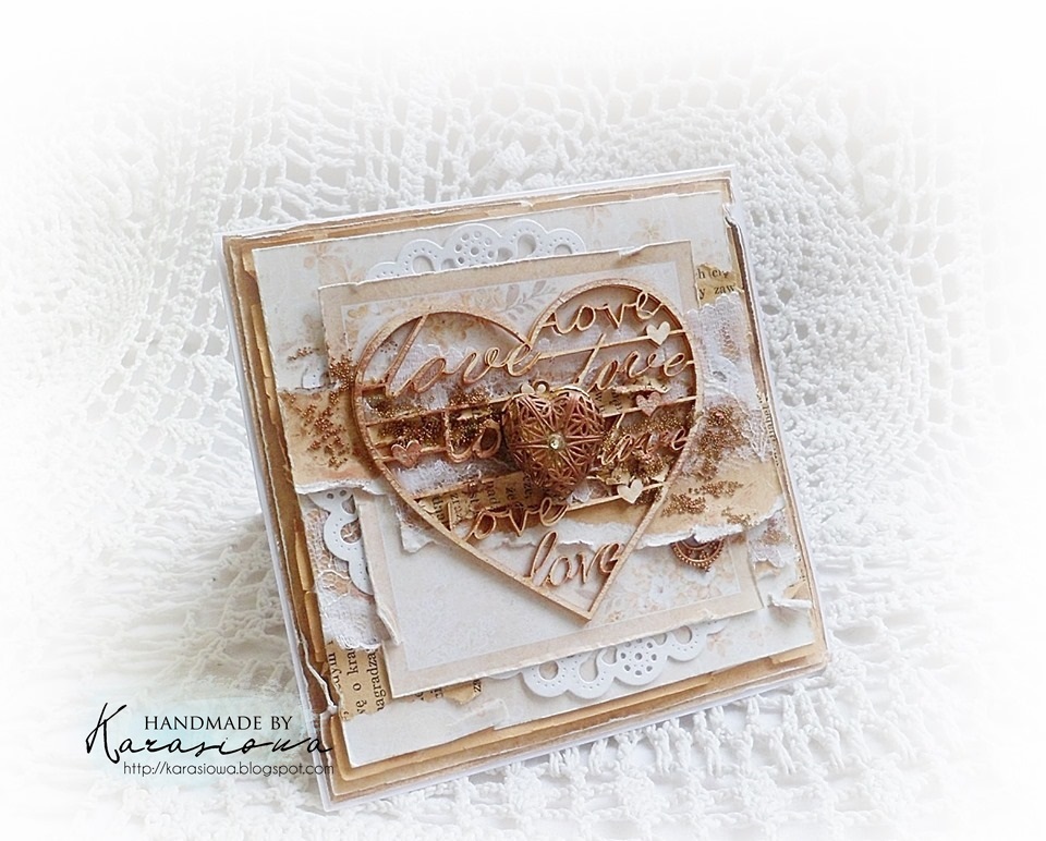 U mnie dziś kartka, wyjątkowo bez kwiatów, ale za to z pięknym tekturkowym sercem i z małą zawieszką - serduszkiem. Utworzyłam mnóstwo udzieranych warstw, także pod tekturką, dodałam także kawałki koronek i starej pożółkłej kartki z książki, mikrokulki i gdzieniegdzie pomalowałam pastą woskową, żeby wyostrzyć kolorystycznie wszystkie dodatki. Jest to inspiracja, dla Miszmasz Papierowy.